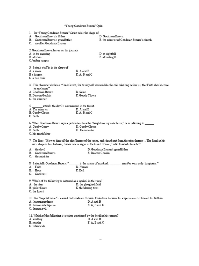 Young Goodman Brown Quiz 1 Pdf Satan Religion And Belief